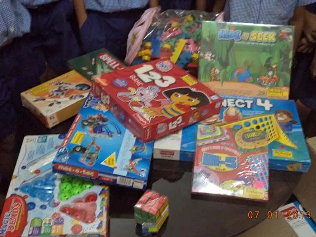 Toys like Chess, Chinese Checkers , Engineering – Mechanical kit , Scrabble , Building Blocks, Magical buildings beads , Number Game , Ludo , Memory Game , Cross words , Calculus – Mathematics set for juniors , Mind Twister – construction set , Alpha Numero, etc, were donated.