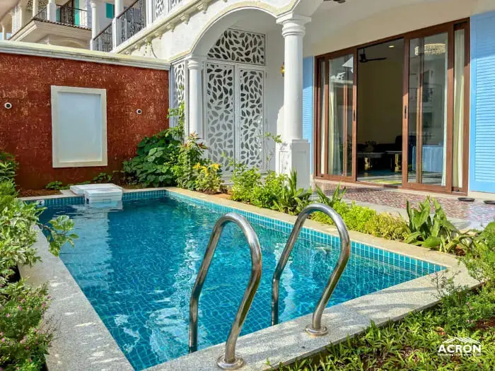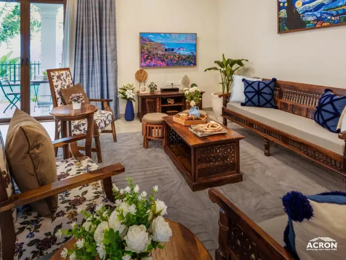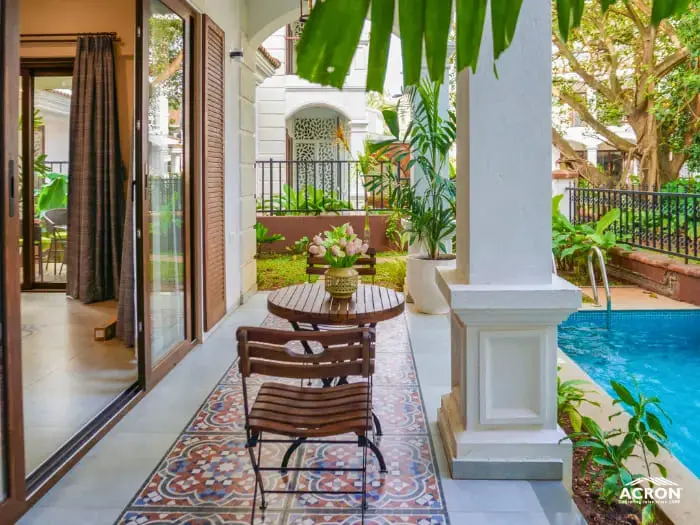 The villas for sale in Goa near beach are well built and super spaced out as well. The gated community has everything you can ask for - a private boat landing, gym, spa, tennis courts, a large common pool. Green and water views.