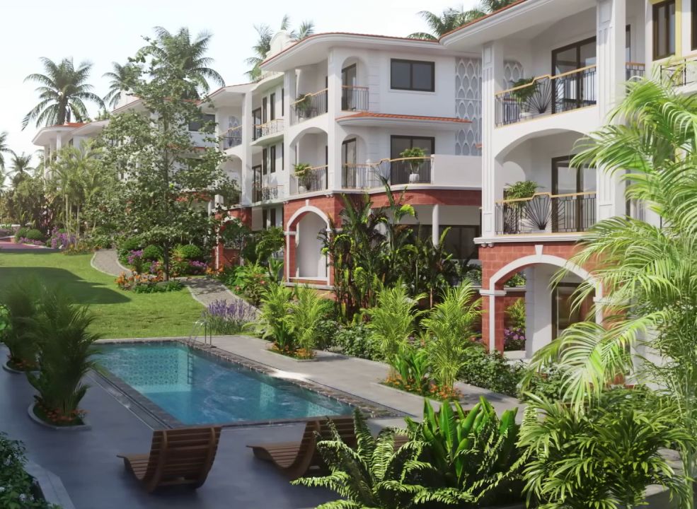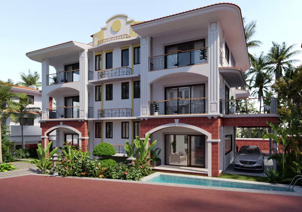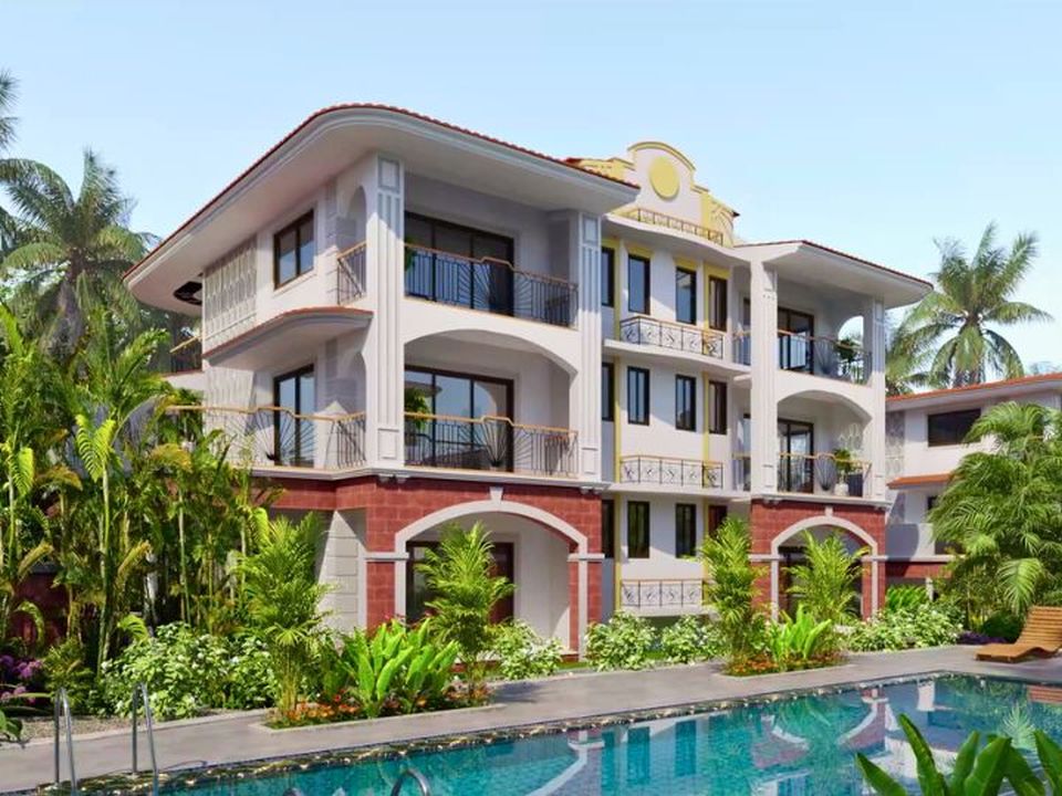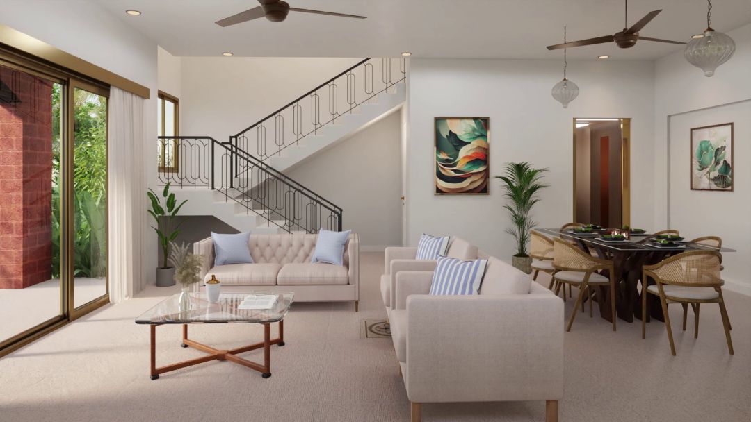 The white exteriors have contrasting laterite stone cladding treatment and tiled eaves. Designed to maximize light and ventilation, the internal layouts are thoughtfully planned with generously high ceilings, wide French doors and large bay windows. The top floors have a covered terrace .